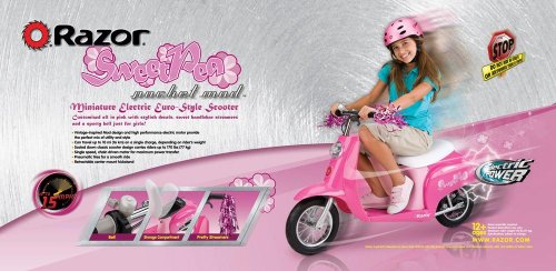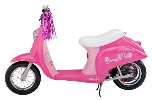 Razor Pocket Mod (Sweet Pea)Cruise the side streets in style with this Euro-style electric scooter from Razor. Featuring a high-performance, chain-driven electric motor and a vintage-inspired body, the Pocket Mod can reach speeds of up to 15 miles per hour--plenty fast enough for a quick trip to the corner store or a fun ride in the country. Made just for girls, this Sweet Pea version of the Pocket Mod comes in a bright pink color and is accented by sparkling handlebar streamers.